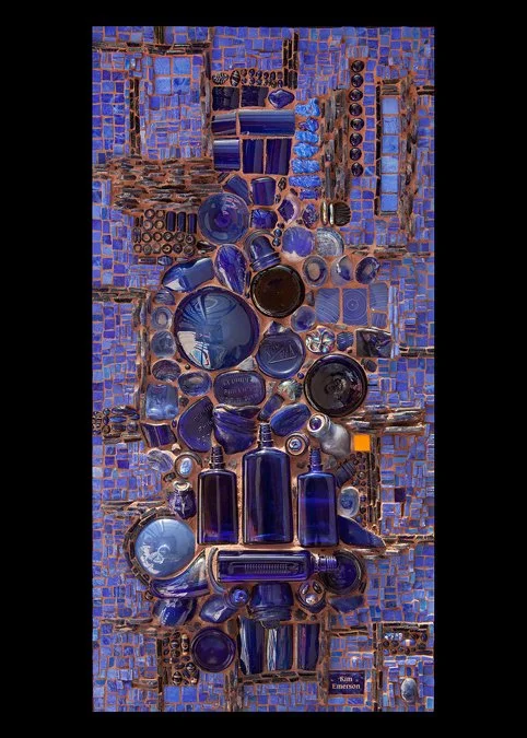 TITLE: Mazel tov Series, ICOBALT BLUESDesign: Wall mosaic on Wediboard in custom aluminum frame Year Completed: 2007Materials: Broken crockery, smalti glass & found elementsDimensions: 18” x 36” x 2” Inquire Inquire