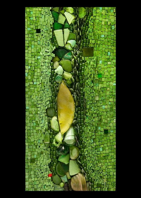 TITLE: Mazel tov Series, IIRaparian GreenDesign: Wall mosaic on Wediboard in custom aluminum frameYear Completed: 2008Materials: Broken crockery, smalti glass & found elementsDimensions: 18” x 36” x 2” Inquire Inquire