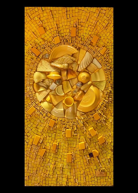 TITLE: Mazel tov Series, IVExplosion In YellowDesign: Wall mosaic on Wediboard in custom aluminum frameYear Completed: 2009Materials: Broken crockery, smalti glass & found elementsDimensions: 18” x 36” x 2” Inquire Inquire