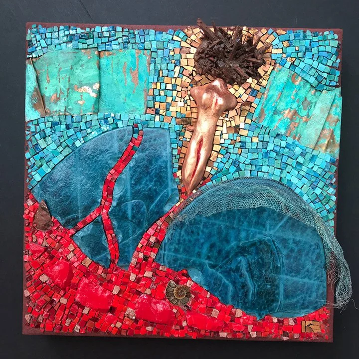 Materials: Smalti glass, crystal cluster, an ammonite, natural stone elements, patina’d copper & mesh, hand-built ceramics & copper gold leaf