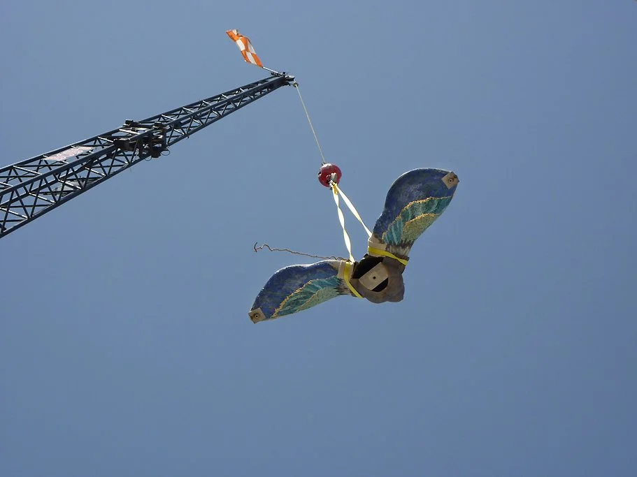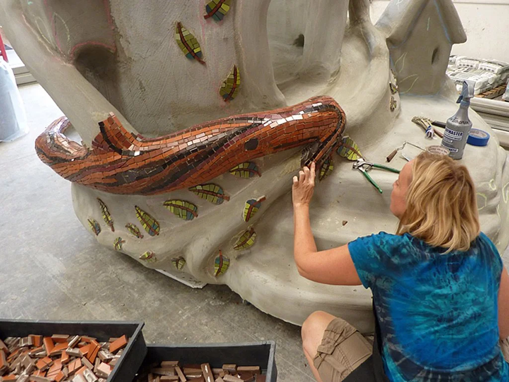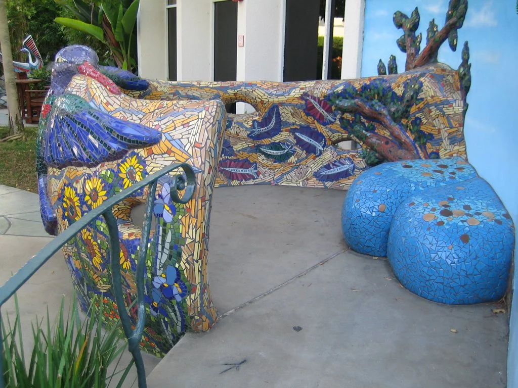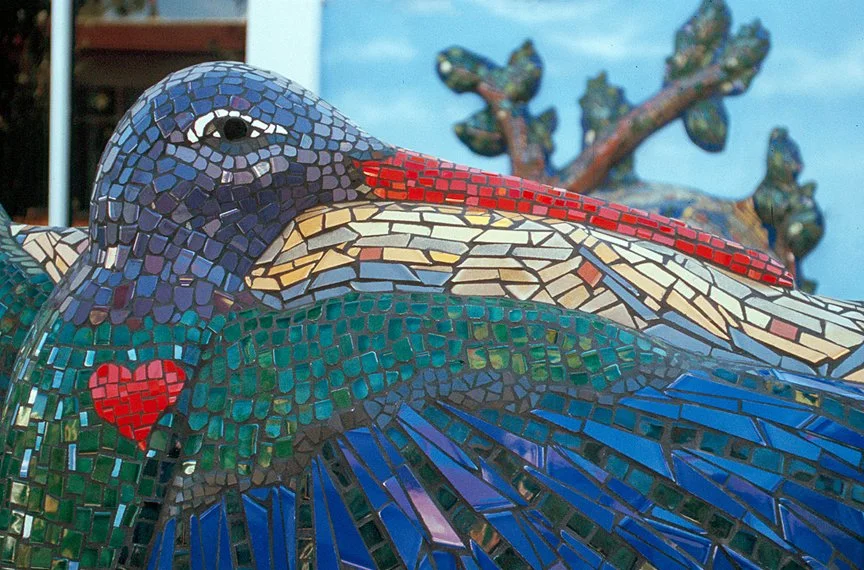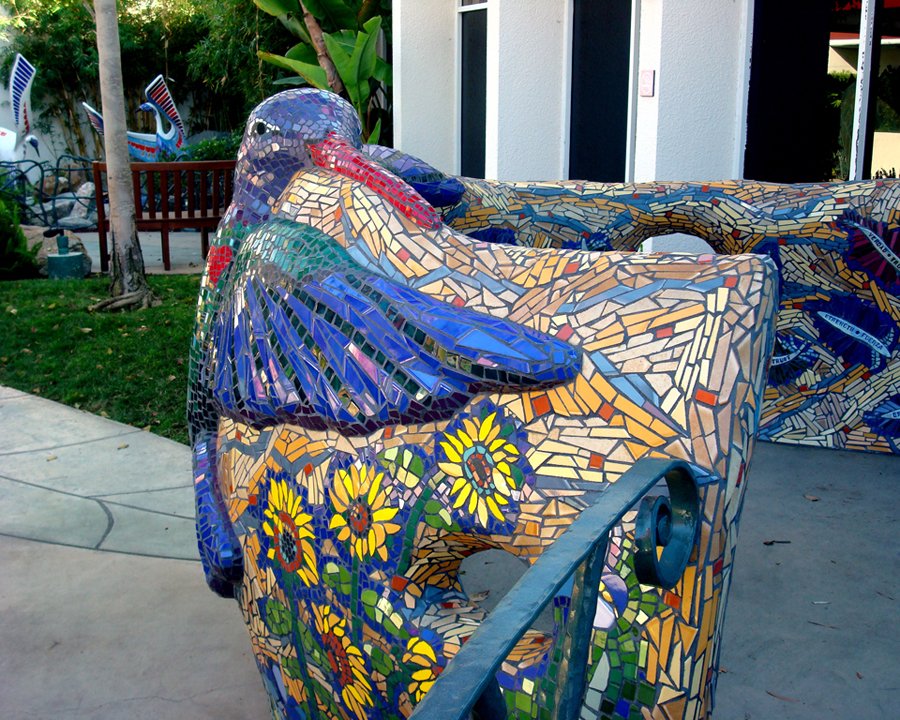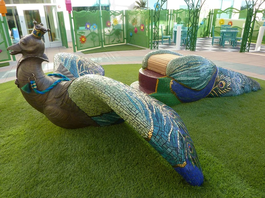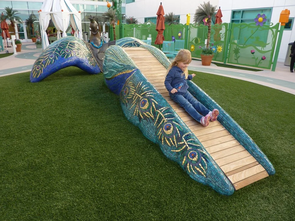 Marisa is a large mosaic and bronze interactive sculpture and a very special project that evokes child’s play and imagination. This significant sculpture is a magical and powerful example of how the arts can promote healing in the health care environment. It was a collaboration with Kim Emerson, T.J. Dixon and James Nelson. Marisa’s moveable head is cast in bronze, she has pony reigns, with wings and a tail that were hand-carved by the artists out of expanded EPS foam. Ultimately, the EPS foam portions were coated with cement, and embellished with colorful ceramic tile mosaics. Marisa’s ten-foot long tail of feathers also functions as a slide where children can enjoy and play. As if almost ready to take flight, Marisa is gracefully, prominently and proudly perched on top of a large mound of soft green turf, placed at the center of the garden, where she watches and is cherished by all!