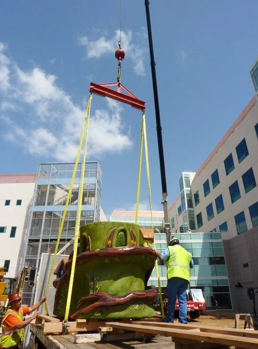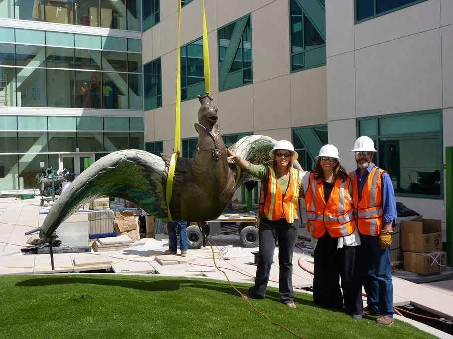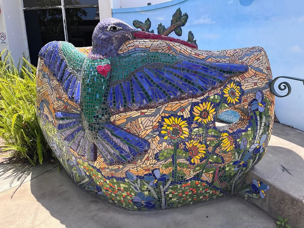 Fast forward, in 2024, the original Carly’s Magical Gardens was demolished to make way for a new seven story children’s health facility to be built over the first gardens and original buildings. Most of the artists’ artworks were salvaged, and hopefully they will find new spaces for them. Unfortunately, the Giant Hummingbird’s Nest was not able to be saved. While there was some consideration about how to remove and relocate the 10’ in diameter sculpture, Rady Children’s Hospital did not find the value in doing so. She served patients, families and staff for 25 glorious years, and she will always be considered one of the most beautiful art pieces in all of the gardens.