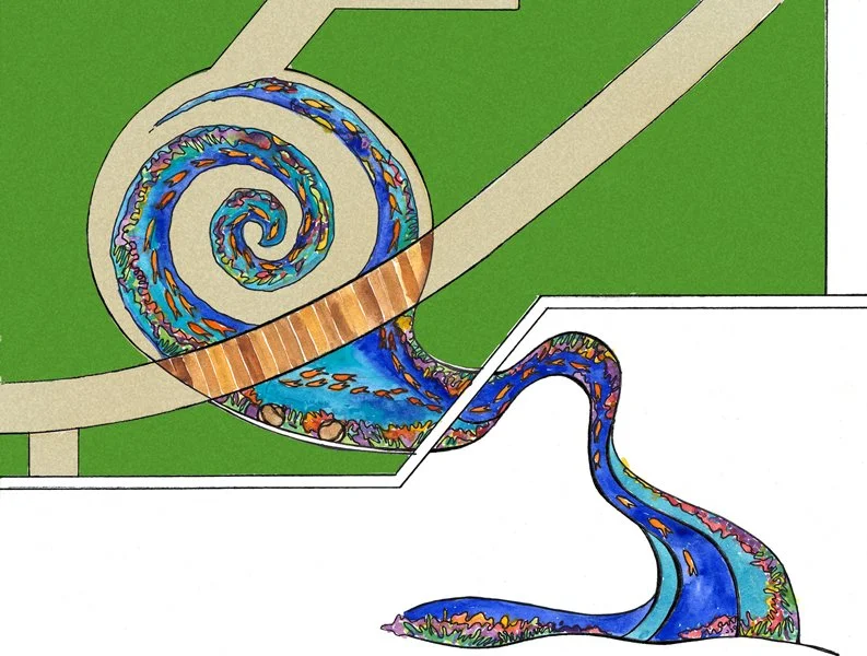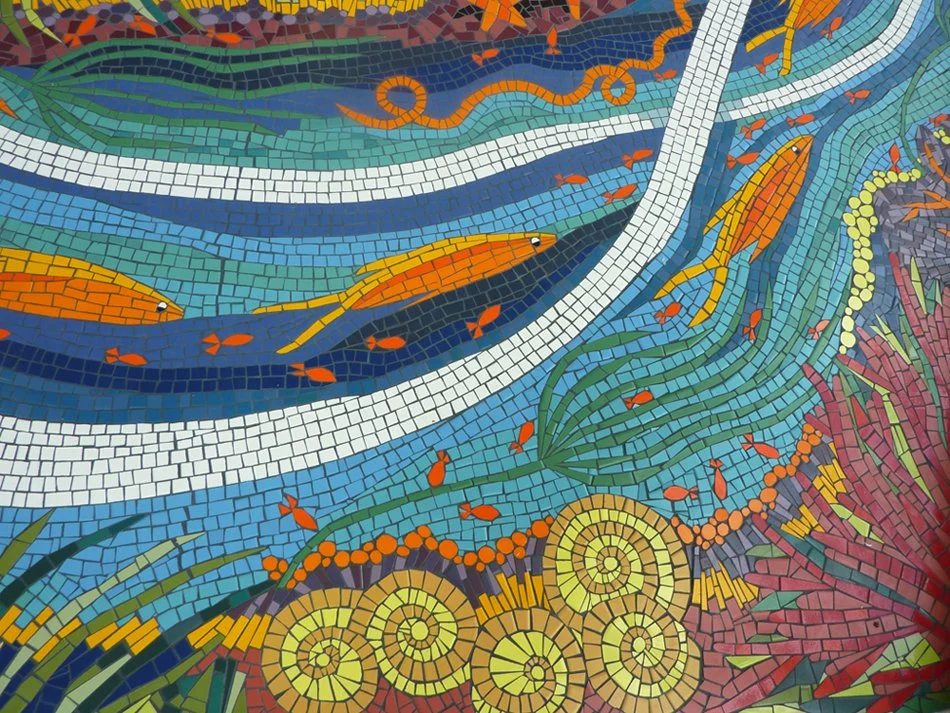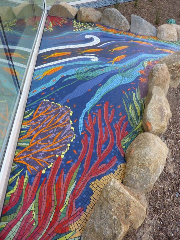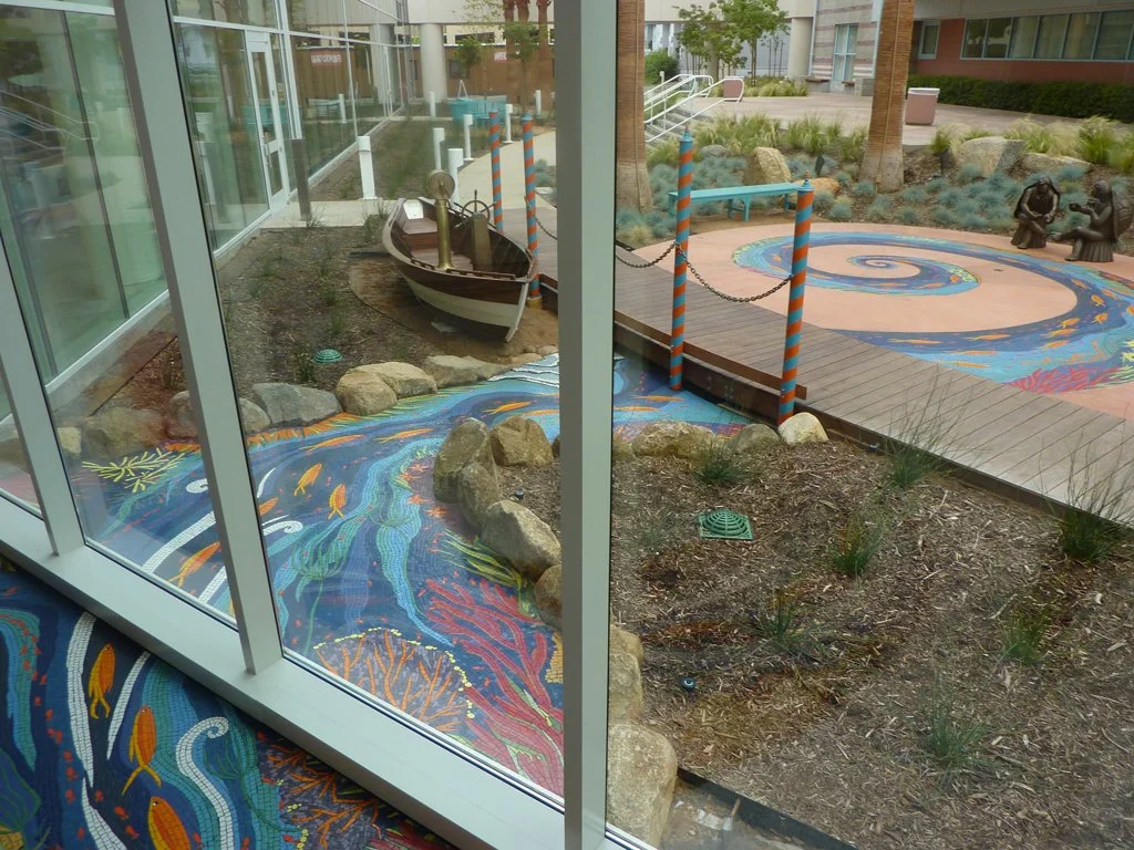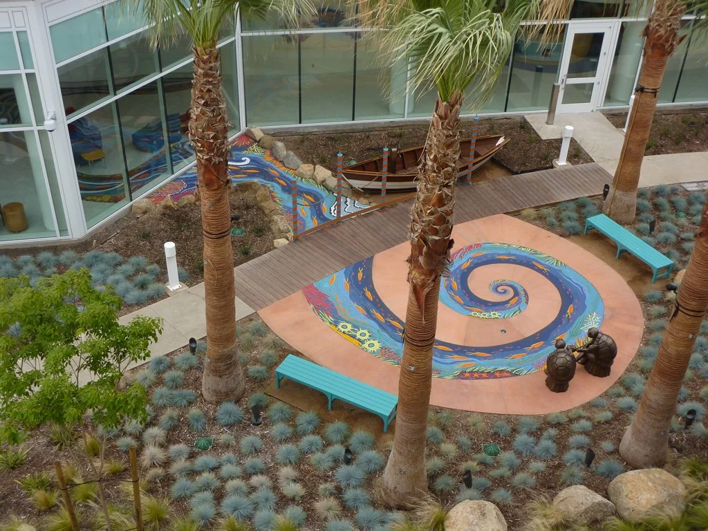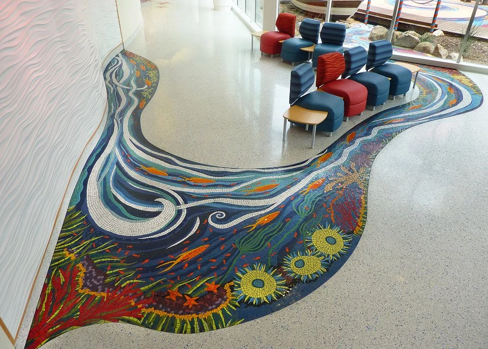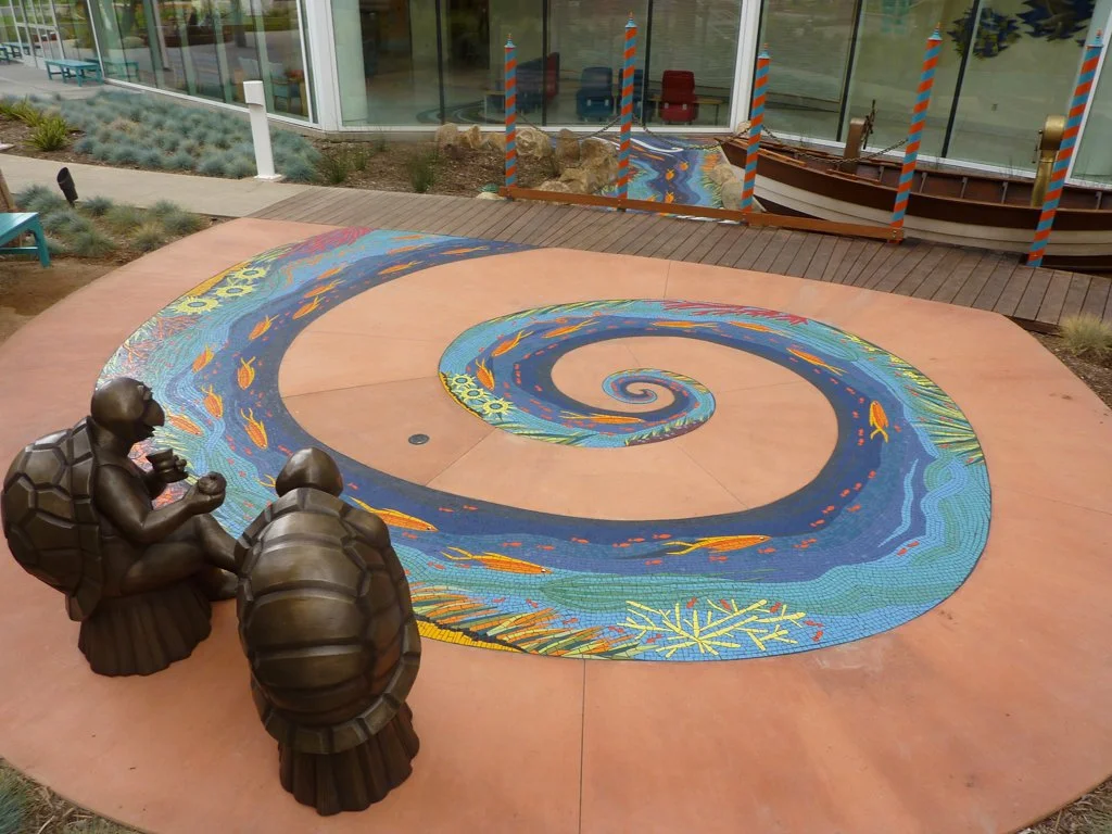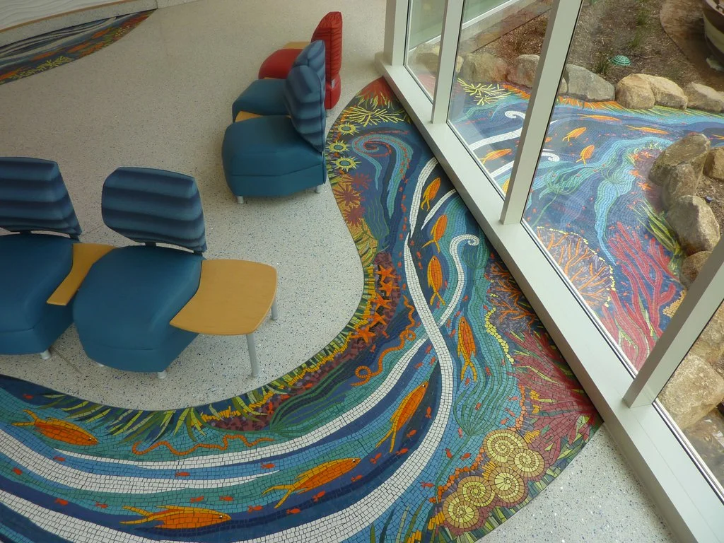 The River of Life floor mosaic was planned early in the design process of the newly constructed Acute Care Pavilion. The success of most public art projects often depends on how early the artist’s vision can be applied to the architect’s conceptual design, and this is a great example of that collaboration. The chosen theme of ocean is visually present in other decorative elements located throughout all four floors of the health Acute Care Pavilion. The large floor mosaic, lush in color with sea-life, waves, and underwater scenery, begins in the main lobby at the ripple textured plaster wall, it dances across the main lobby area, making its way to the window appearing as though it flows under and through, outside past a boat, under a bridge, and into the garden. Visible through the windows, from inside and the upper levels above, the River of Life floor mosaic continues to flow into a large spiral where two bronze “turtles taking tea by the tidelands”.