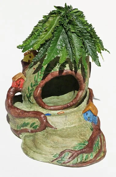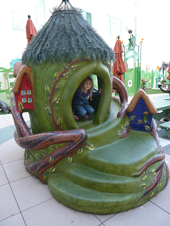In collaboration with master sculptors, T.J. Dixon and James Nelson, the solid EPS foam shape of this Giant Treehouse was hand-carved with hotwire tools and rasps, coated with green tinted cement, with some details of high-fired ceramic tile mosaic. The interactive sculpture has a space where children can climb up and into, there are little bird houses, and the outer tree trunk also functions as a Hot Wheel race track for children to play with, and that winds around and around and around!