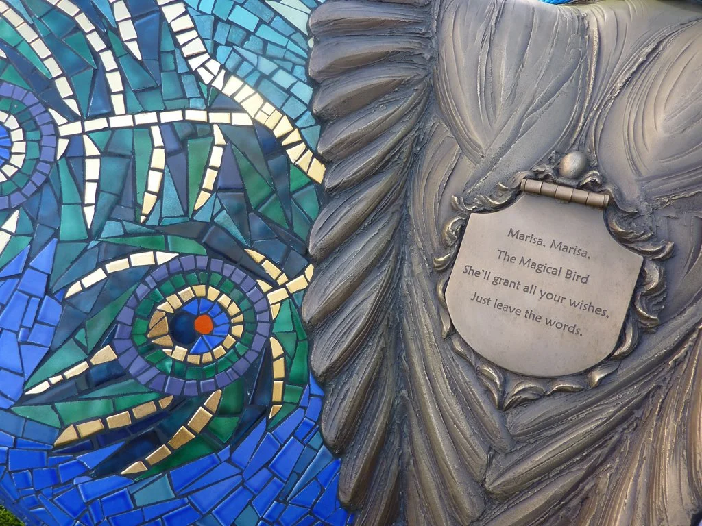“Marisa, Marisa, The Magical Bird. She’ll grant all your wishes, Just leave the words” is inscribed on a small locked secret bronze trap-door. Children are encouraged to insert their written wishes on paper into the special openable locket on a necklace around Marisa’s neck. Caregivers and parents alike secretly retrieve the children’s wishes, and with the high-hopes of being able to grant them.