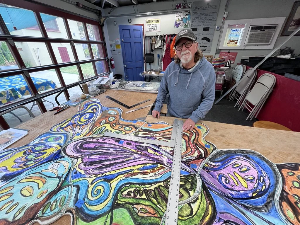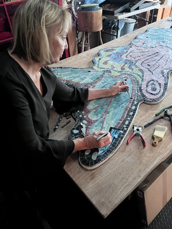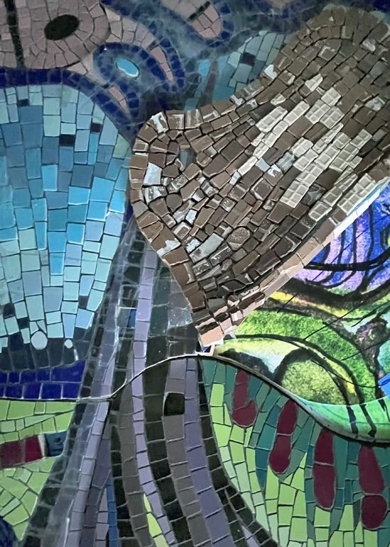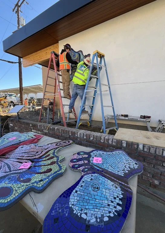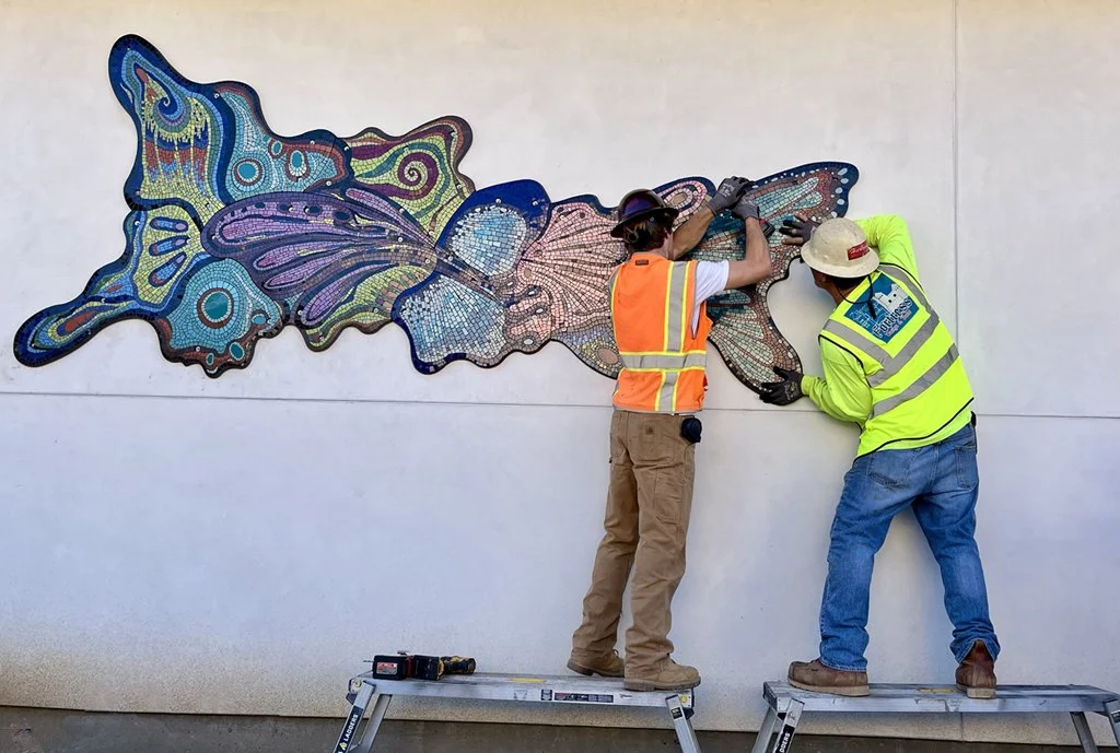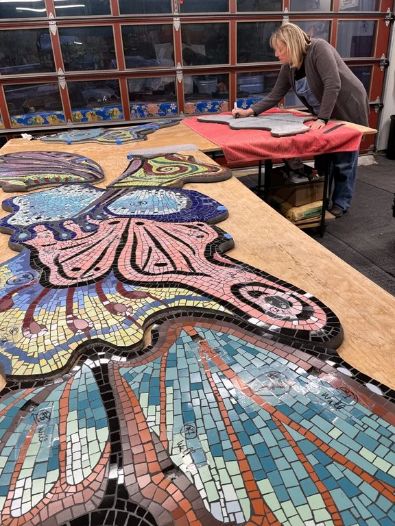 For public art projects like this, Kim Emerson typically works with the beautiful high-fired ceramic tile made by the former Quarry Tile Company, now Fire Clay Tile. First cut by hand on a wet-saw, then nipped further into smaller pieces, the tesserae was laid dry into place with tweezers over the approved design underneath, and on tables in the artist’s studio. While assembling the butterfly shapes for each panel, the mosaics were temporarily segmented face-up with special clear tile-tape. The artist’s design, originally a watercolor painting, was enlarged to a full-scale print on paper, and is known as a mosaic cartoon. After many more steps, ultimately the taped and sectioned mosaics were adhered to cement backer board panels with thin-set and grout.