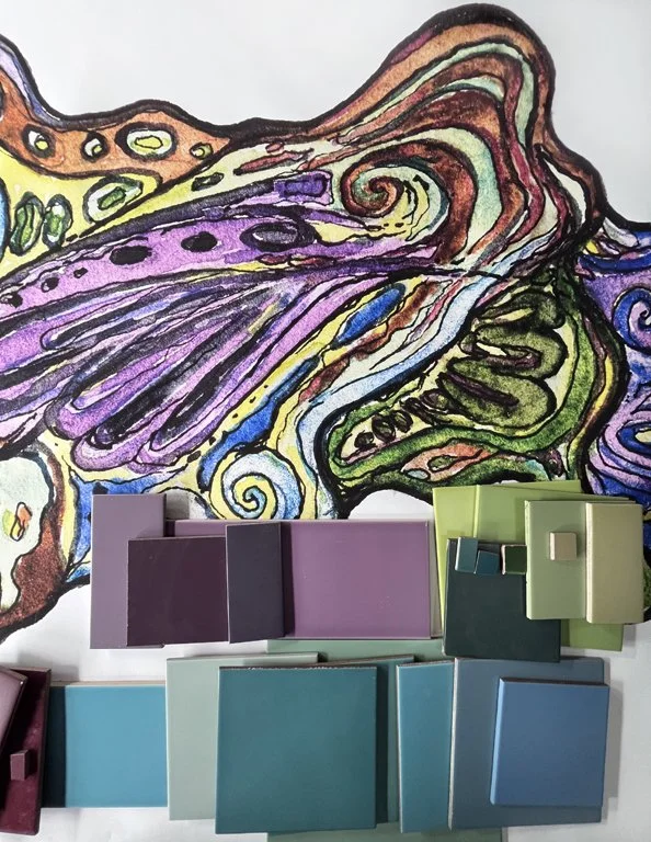 The mosaic mural, Metamorphosis, is made up of seven freeform, abstracted and overlapping butterfly wing designs. Considering that this work of art is made especially for the front entrance to a mental health facility, the design was inspired by the ever-changing shapes, patterns, and various soothing colors of greens, blues, purples and pinks. The project message speaks to the symbolism of the life cycle of butterflies, but also to humanity who has the ability to also change into being healthy, whole, and grounded.