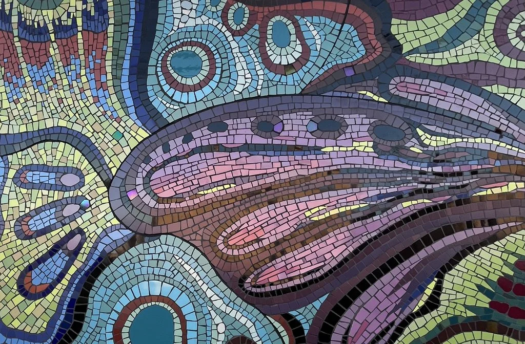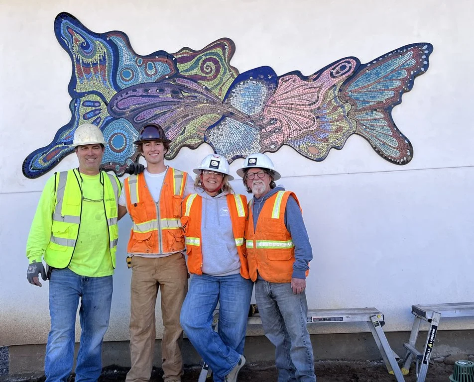 “Psyche” was the ancient Greek word for both “soul” and “butterfly”. Understood in various ancient cultures, and still today for some, the belief is that human souls become butterflies while searching for a new metamorphosis or life. Inspired by the ever-changing patterns found in nature, this mosaic mural represents the evolving beauty of life reflected in the colorful abstract butterfly wing designs, and reminding us that we too can change and grow into ultimately becoming our better true selves.