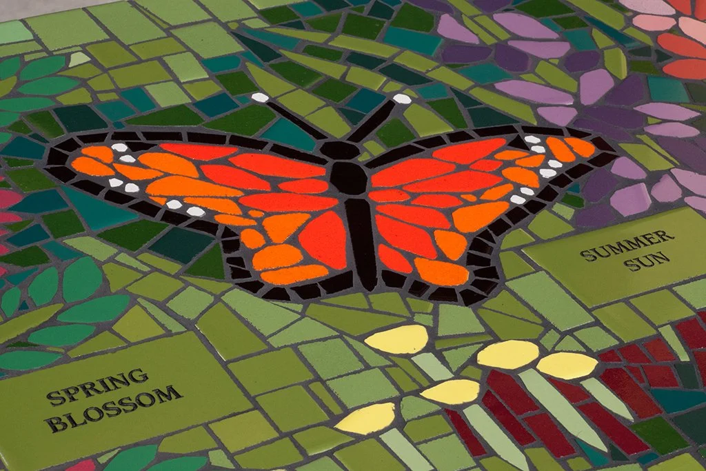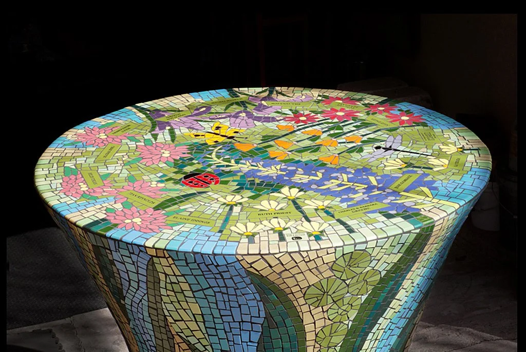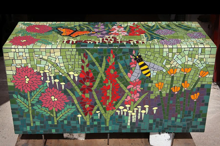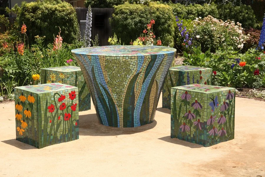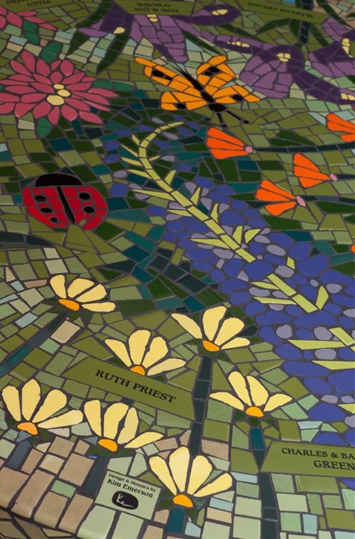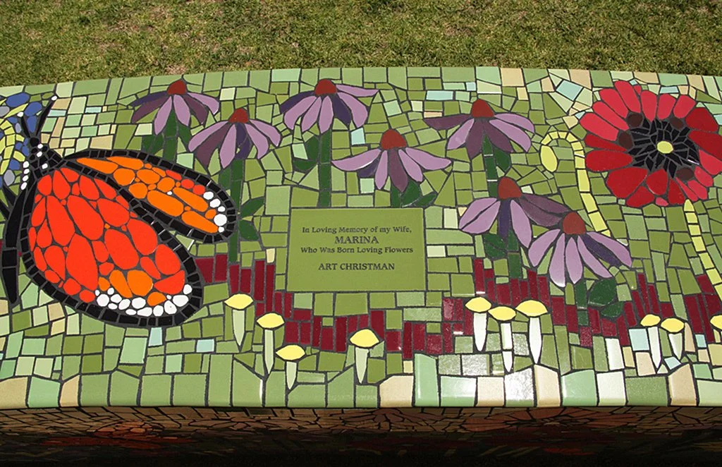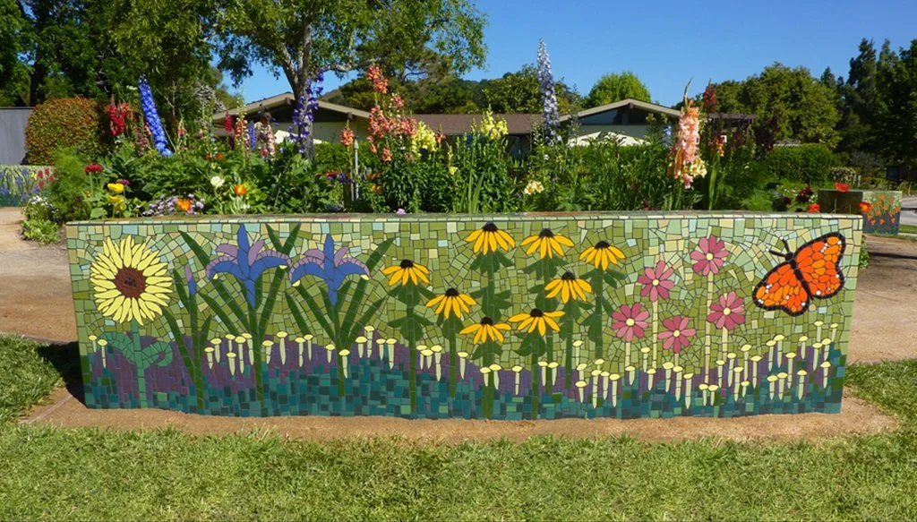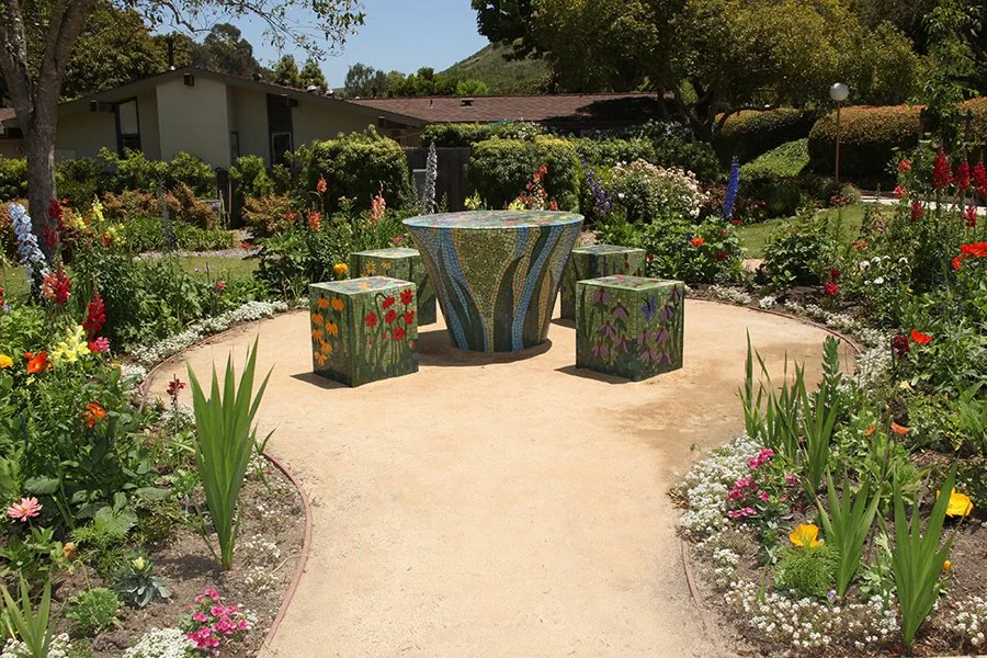 The artist was initially contacted and commissioned by leading Valle Verde resident, Helen Chuan, and along with her Cutting Garden committee members who also reside at this marvelous active retirement community. As a special committee, they together raised the funds necessary for the project, and in full coordination and approval by Valle Verde and the ABHOW Foundation. The artist, Kim Emerson, was totally inspired by the excitement and enthusiasm Helen expressed, and especially when she stated that she envisioned mosaic benches in the garden for the residents to relax and enjoy, and she wanted them to resemble the soft colors in nature found in paintings by French Impressionist, Claude Monet.