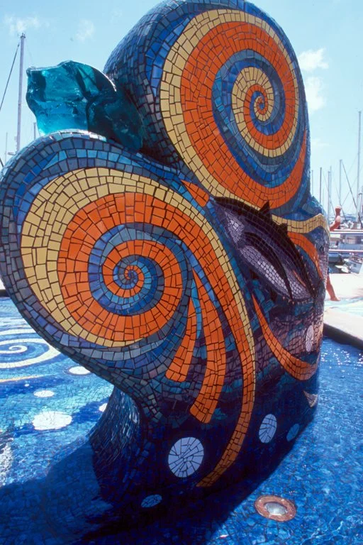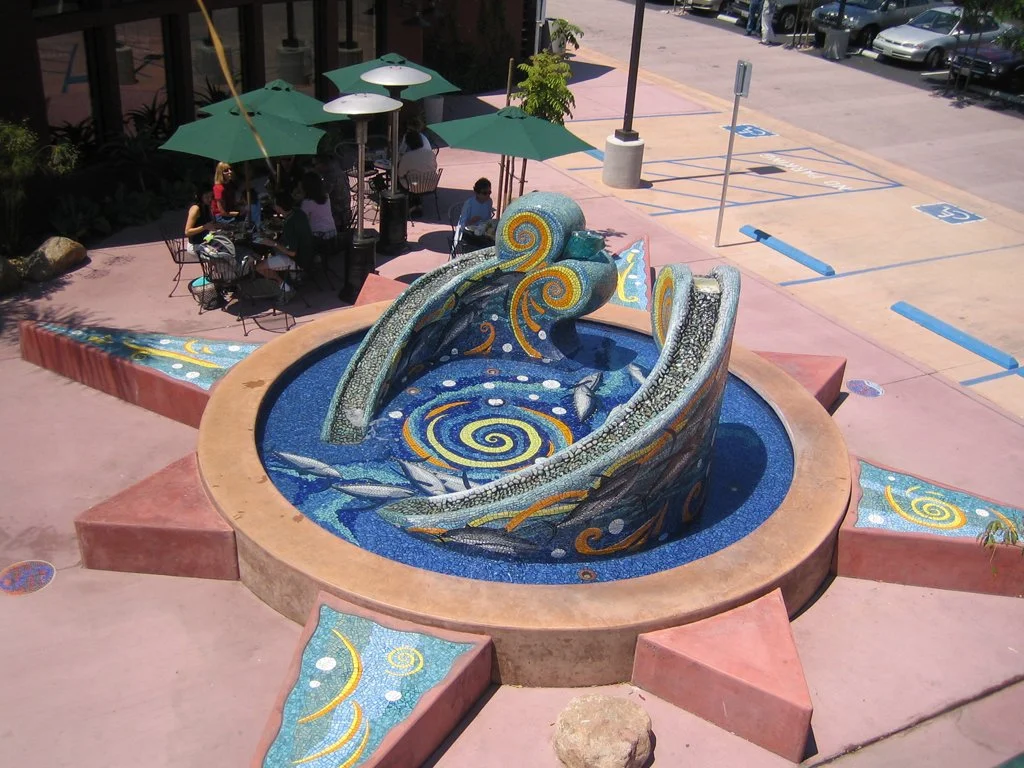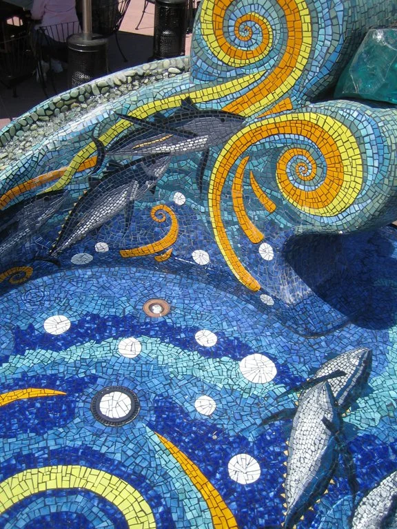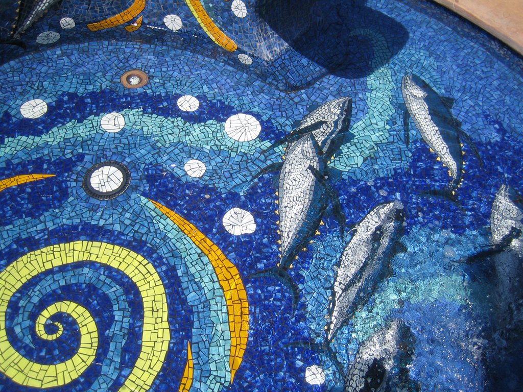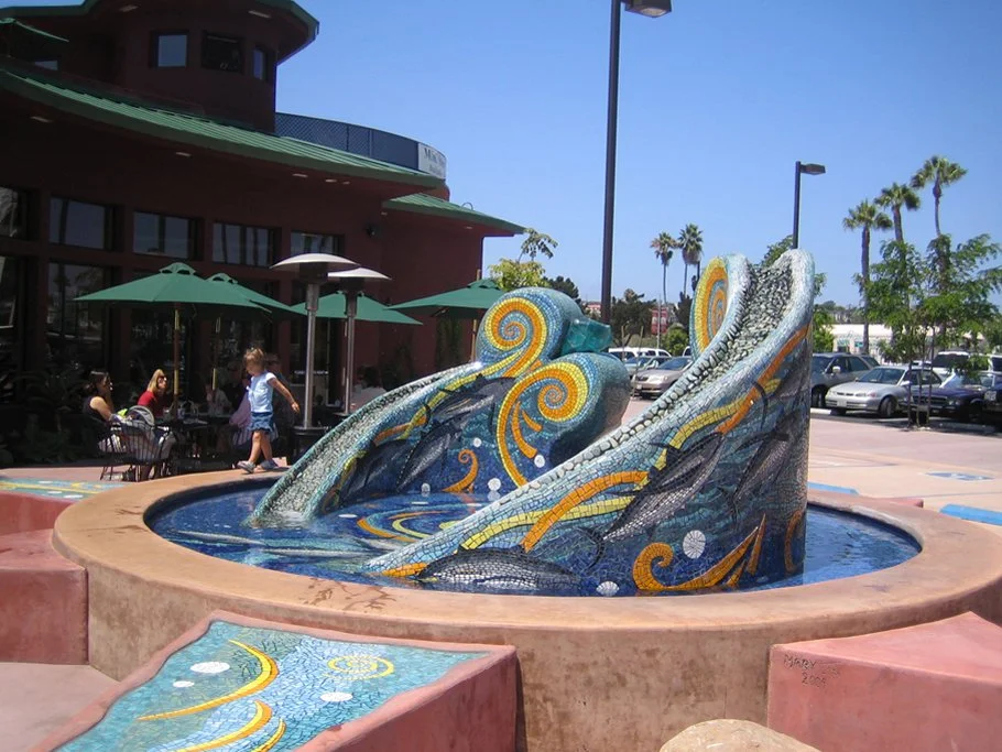 On the water’s edge of the bay of San Diego, located at one of the most beautiful yacht harbors in the city, Ocean Dances celebrates the history and current sports fishing of the area. The project is a large sculpted water fountain, and covered with over 400 square feet of oceanic colors in ceramic tile mosaic. The project was a candidate of the Port of San Diego’s percent for art component for the newly remodeled Sun Harbor Marina. The fountain’s abstract forms are in the shape of two waves rising up and above the water, and placed within a cast concrete pool. The forms were hand-carved out of EPS foam, imbedded with rebar, covered with a thick waterproofing membrane, and embellished with the mosaic designs. Water flows from the top of the wave forms, downward through pebbled troughs, and into the basin pool below. The transparent rock made of slag glass is lit at night from behind with fiber optics. The fish in the mosaic design are Albacore Tuna, which are the main catch for the private sports fishing fleet located adjacent to the Marina. The project for Sun Harbor Marina was the first LEED Certified marina in the world.