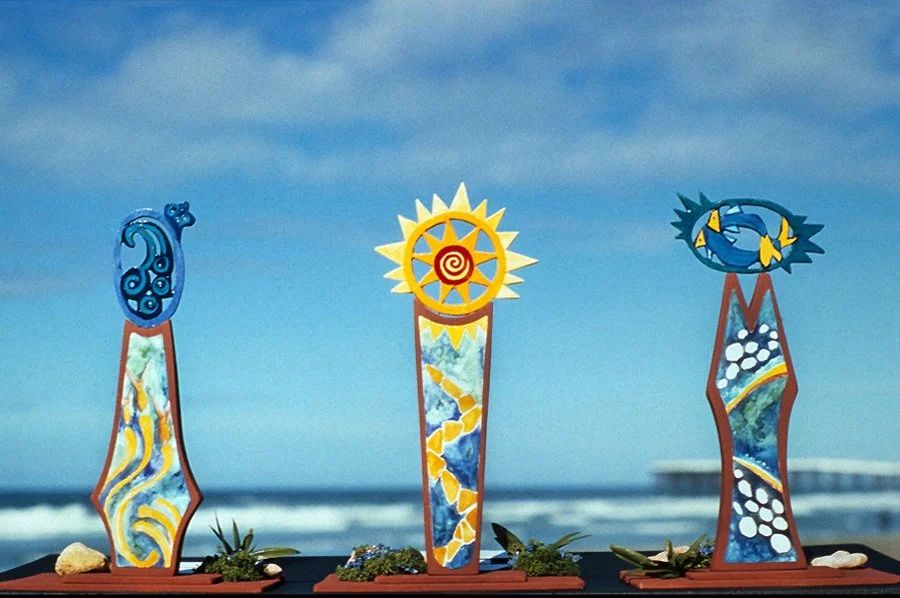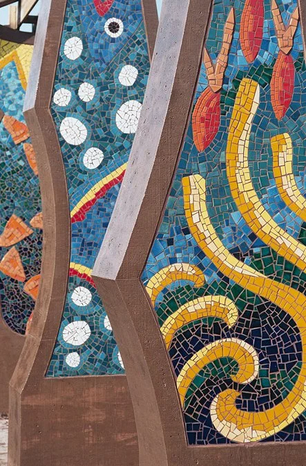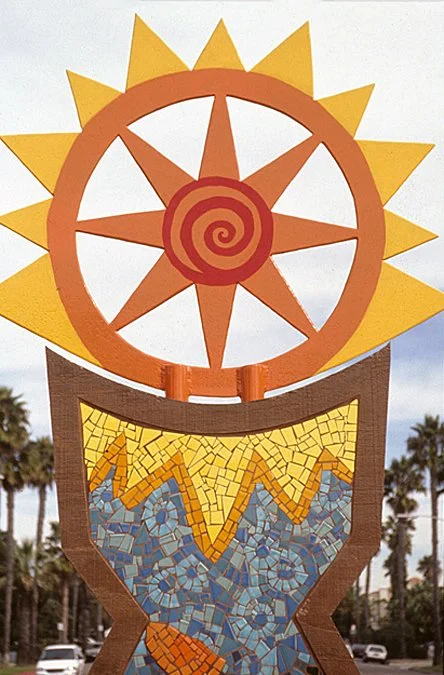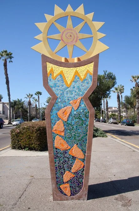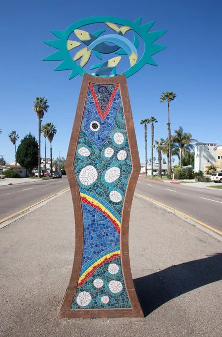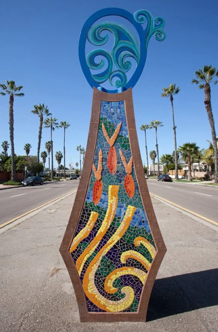 Designed as progressive or sequential teaser signs that build anticipation mile by mile (which first appeared and made popular during the highway booms, particularly the 1950s-1960s, and now what is known as “roadside Americana”) is the theme behind this project, hinting at what lies ahead when heading west on Grand Avenue towards the big blue Pacific Ocean! Each permanent cast concrete with recessed mosaic freestanding sculpture indicates what is ahead, and that being the beach, ocean life, fun in the sun, surfing the waves – a true celebration of the community of Pacific Beach and the San Diego region!