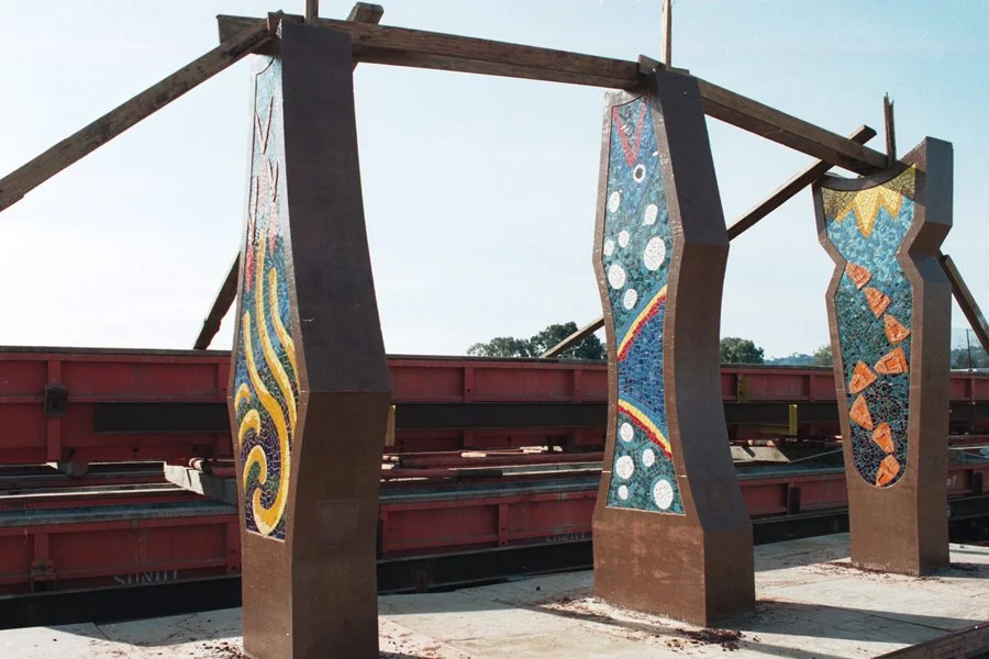 Materials: High-fired ceramic tile mosaic, powder-coated and hand-painted steel, & cast concrete
