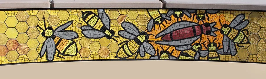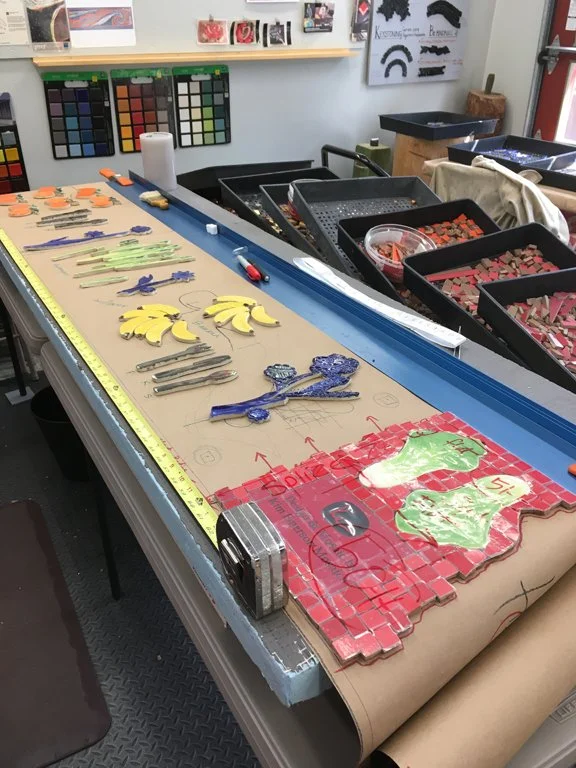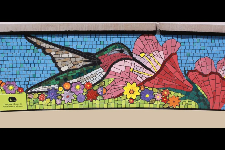 For public art projects such as these, Kim Emerson typically works with the beautiful high-fired ceramic tile made by the former Quarry Tile Company, now Fire Clay Tile. First cut by hand on a wet-saw, then nipped further into smaller pieces, the tesserae was laid dry into place with tweezers on tables in the artist’s studio. While assembling the designs for each project, the mosaics were temporarily segmented face-up with special clear tile-tape. The artist’s design, originally a watercolor painting, was enlarged to a full-scale print on paper, which is known as a mosaic “cartoon”. After many more involved steps, the taped, numbered, and mapped segments of mosaics were carefully transported to the site, and directly adhered with thin-set and grout to the newly constructed concrete structures.