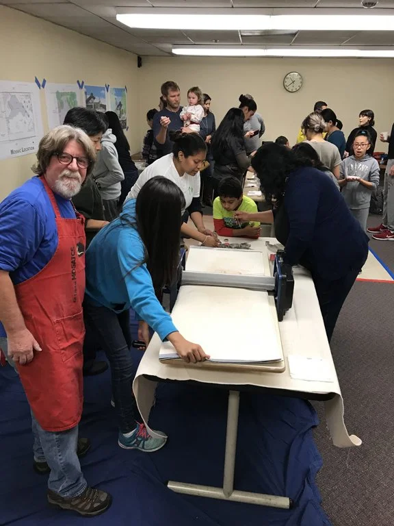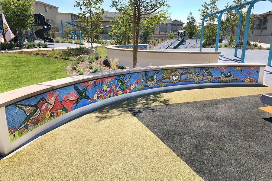 The mosaic artwork designs for these 3 parks incorporated engraved or etched tiles that were specially made by Tara Tarant of La Jolla Stone & Etching. For example, a total of 184 names of community members and families were commemorated on leaf shaped cut tiles, and incorporated into the mosaic artwork at Wishing Tree Park. All 3 parks feature a donor recognition mosaic located somewhere in each park. These donor components incorporate engraved named tiles with logos, a “storyboard” explaining about the history of the site, and recognition of all of the public agencies and non-profit organizations who financially supported the project. At both Madison Avenue Park and Bicentennial Park, the artist conducted community hands-on tile making days where children and adults from the community worked together rolling-out fresh wet clay that were shaped into tiles, and painted glaze on bisqued tiles. The community’s work was brought back to the artist’s studio, where the tiles were fired in their kiln, and later incorporated into the overall mosaic artwork.