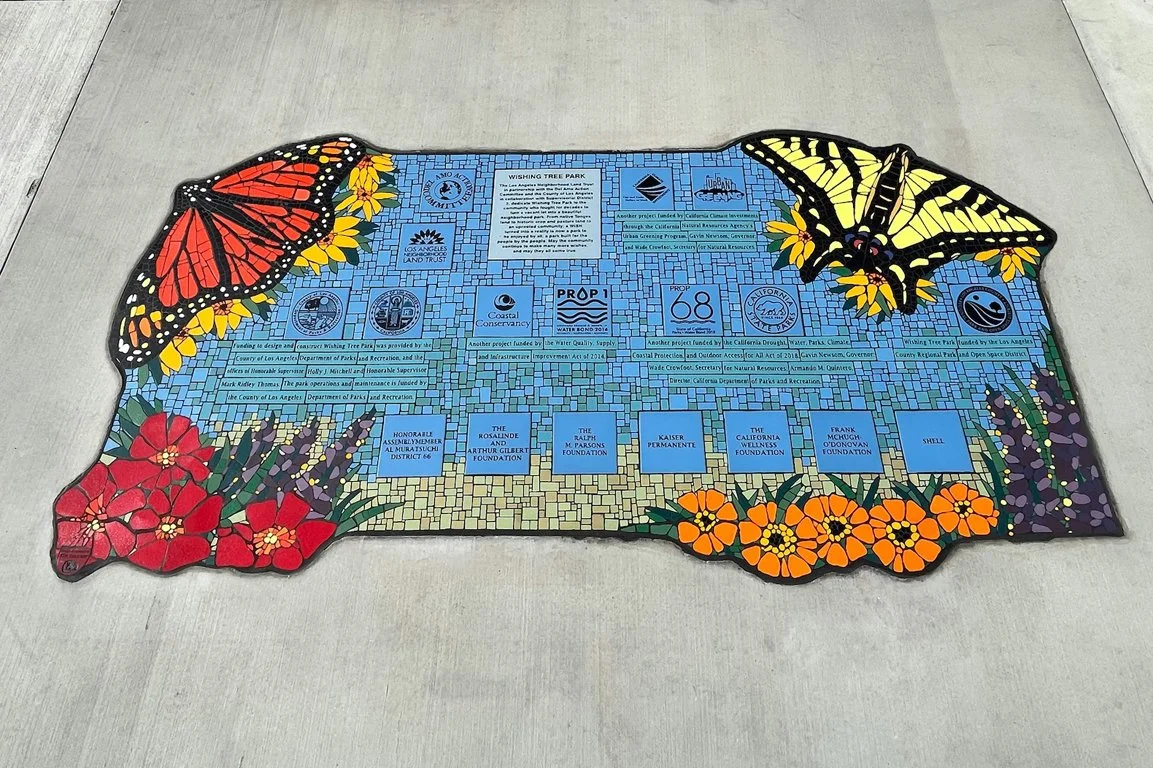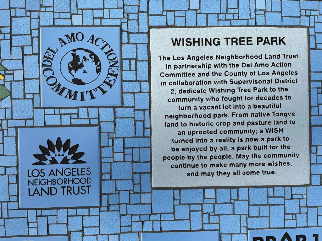 Wishing Tree Park is situated between unincorporated East Torrance and West Carson. The LANLT acquired 8.5 acres of land that had once been a toxic industrial chemical waste site, homes were built, and then serious illness fell upon the uninformed residents. The Del Amo Action Committee (DAAC) was founded, a class-action lawsuit ensued, people moved away, the houses were raised, and the toxic ground sat vacant waiting for a serious cleanup. Several decades later the land was purchased by the LANLT, the soil was removed and replaced, and the area is now a beautiful and vibrant public park. From community input, the inspiration for the mosaic designs came from the surrounding wildlife that returned to the land decades after, and also positive words of inspiration written in both English and Spanish.