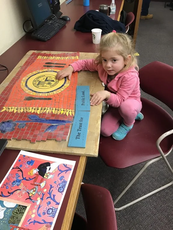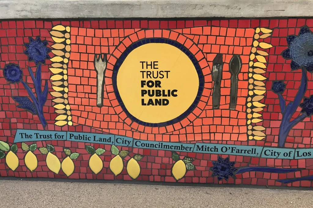 Madison Avenue Park, located in the City of Los Angeles, in the community of East Hollywood, was a project sponsored by The TPL. The parcel of land there was once an apartment complex that had burned and sat vacant for decades. The very popular park design is divided into one half being a play space for children, and the other half is a community garden with an education center building. The inspiration for the design came from Henri Matisse’ famous painting entitled “The Red Tablecloth” with tiles of the vegetables that would be grown in the community garden. The donor’s names were cleverly designed as place settings at the table, with plates for the names, alongside knives, spoons and fork tiles made of hand-rolled clay.