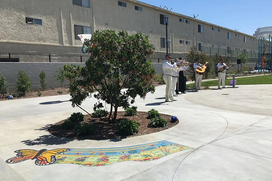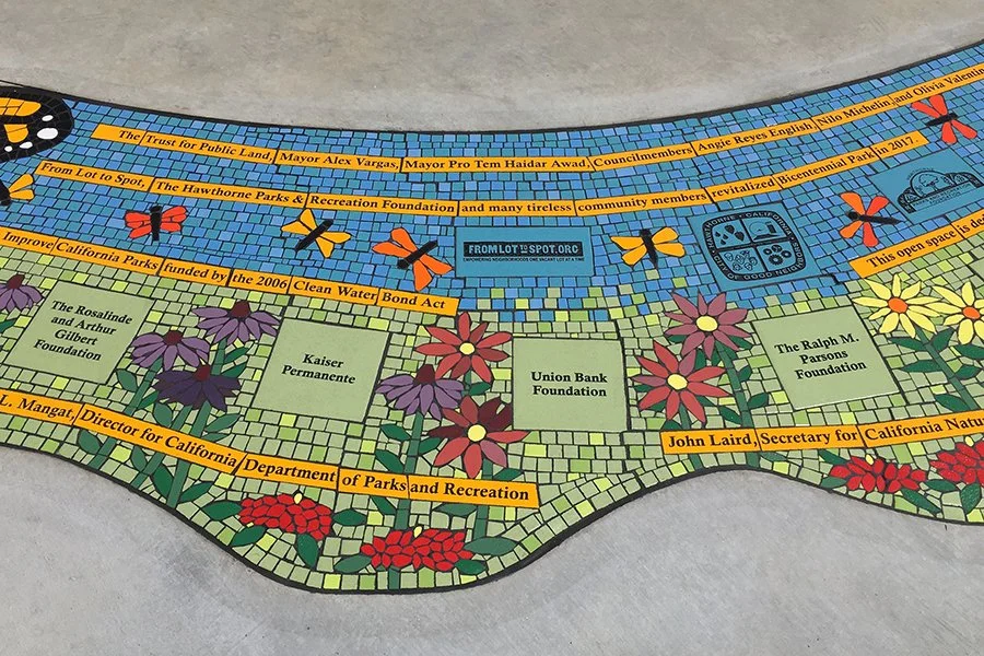 Bicentennial Park, is located in the City of Hawthorne, and it was developed as a public tennis court park in 1976. Through the years, the urban space, with apartment buildings densely packed all around, sat in ruin and was a magnet for unwanted gang activity. The TPL purchased the land and developed it as a green space, designed with play equipment, a walking path, and a splash pad for summertime water cooling. The mosaic design inspiration came from wildlife in nature that flies; hummingbird, honey bees, and Monarch butterflies.