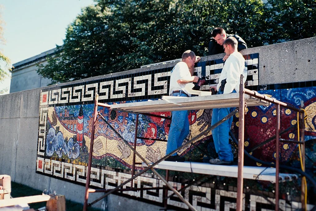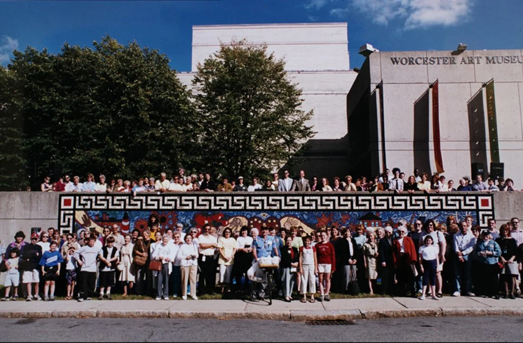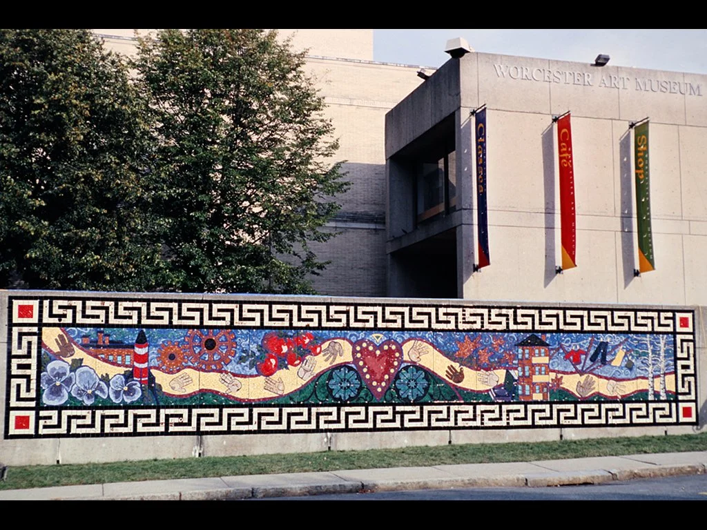 To create the mural, the Worcester Art Museum commissioned the artist Kim Emerson to work in residence with two apprentices, and enlisted the help of community members ranging in ages from 5 to 80. Children and adults at 14 community schools and organizations—including May Street, Elm Park and Clark Street schools; Quinsigamond Community College Women's Center; YouthNet; Fallon Healthcare; AIDS Project Worcester; The Antioch Association of Worcester; Office of Elder Affairs; Black FBI; Centro Las Americas; Italian American Society; Big Brothers/Big Sisters of Worcester; and Arts Worcester—all worked with Emerson on the mural project. In addition, community groups, including CASA, Rainbow Childcare, and Friendly House among hundreds of other friends of the Museum helped paint 3" square border tiles. Approximately 700 individually painted tiles were needed to complete the classically-styled “Greecian key” border design that runs around the perimeter of the mural, as well as the original 1880’s WAM building.