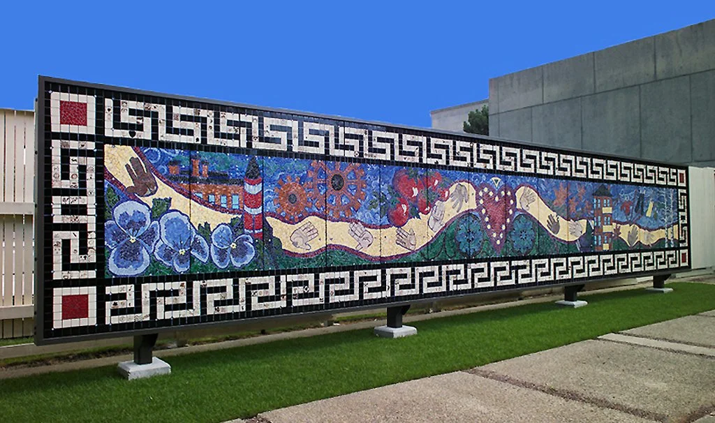 Project Design: Mosaic mural made-up of 48 individual panels, & bolted to the exterior masonry wall