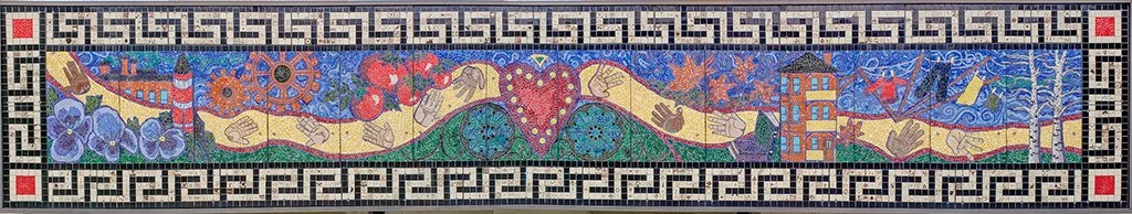 Inspired by the Worcester Art Museum's renowned collection of Roman floor mosaics, unearthed from the ancient city of Antioch, Worcester’s Community Mosaic reflects the themes of “Worcester” and “community.” Its design celebrates the city's diversity, history, learning institutions, inventors, neighborhoods and culture; including representations of the four seasons, a triple decker house, Robert Goggard’s rocket, and of course - the heart of the Commonwealth of Massachusetts.