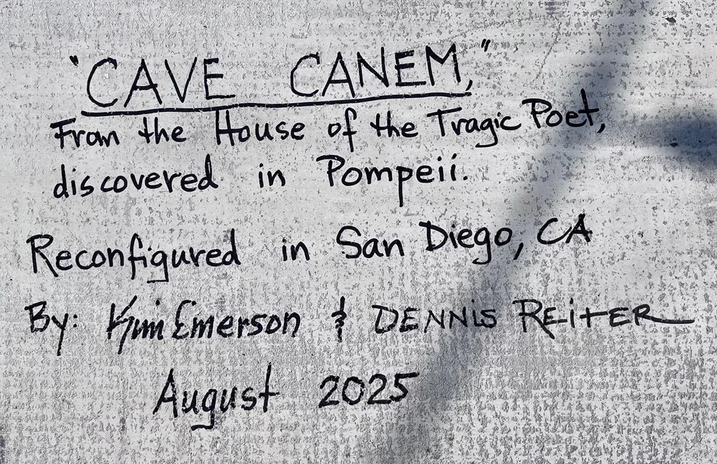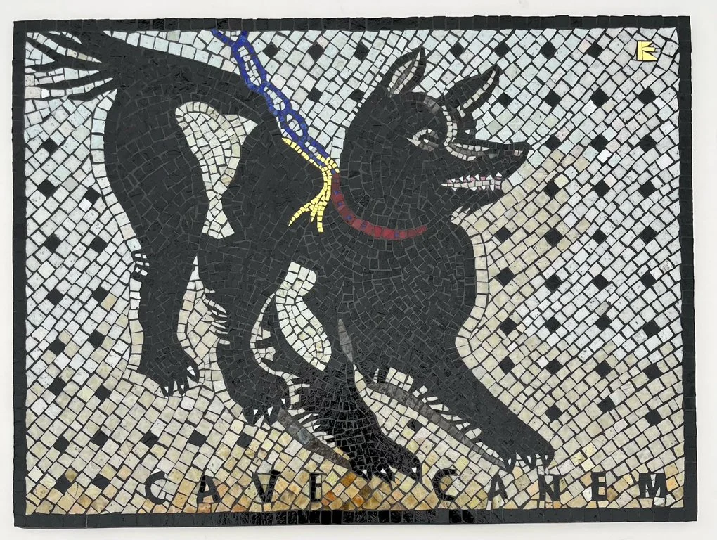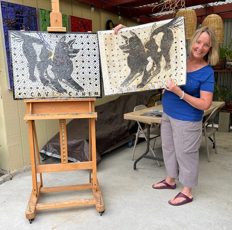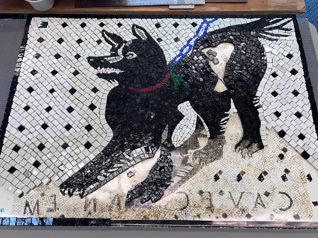 The infamous ancient Roman mosaic in the vestibule of the House of the Tragic Poet, was found and excavated from under thick ash in Pompeii, Italy. Kim Emerson recreated this custom piece for her dear friend and client who is a canine veterinarian. She was put to the task of keeping the true original design as much as possible, while scaling it down and adapting it for her client’s long-time dream of having this particular mosaic for her own. Kim’s husband, Dennis Reiter, contributed in a major way with his photograph of the image from a quality book, and digitally enlarged it to the desired size, and it was printed in reverse. Each tesserae was glued upside down with temporary flour paste onto the print. When finished, it was flipped into the wet thin-set adhesive onto a backerboard panel - and with so many additional steps in between…And yes, the harness of the dog’s collar appears to have been originally made with gold smalti, so we honored that. The Romans too loved their dogs!