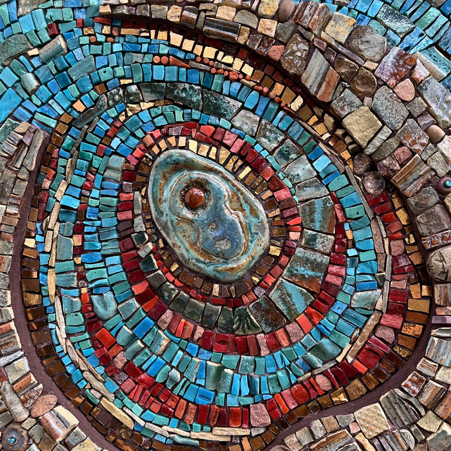 MATERIALS: smalti (glass), natural & semi precious stone, handmade by the artist ceramic tile elements, on wood for indoors, and with tinted thin-set.