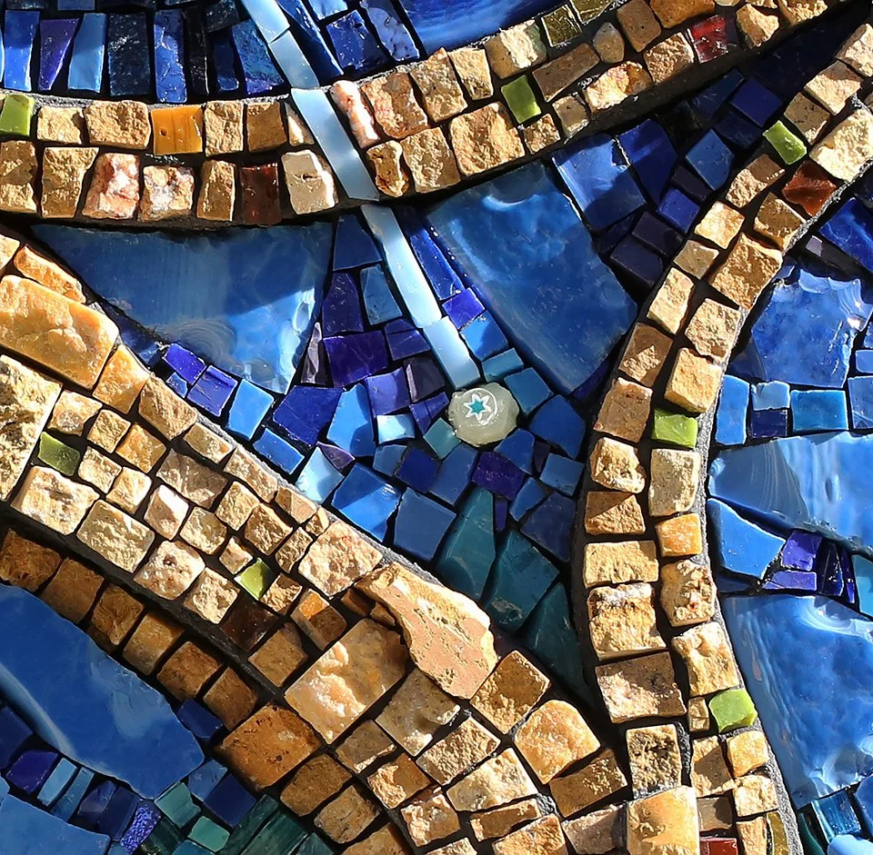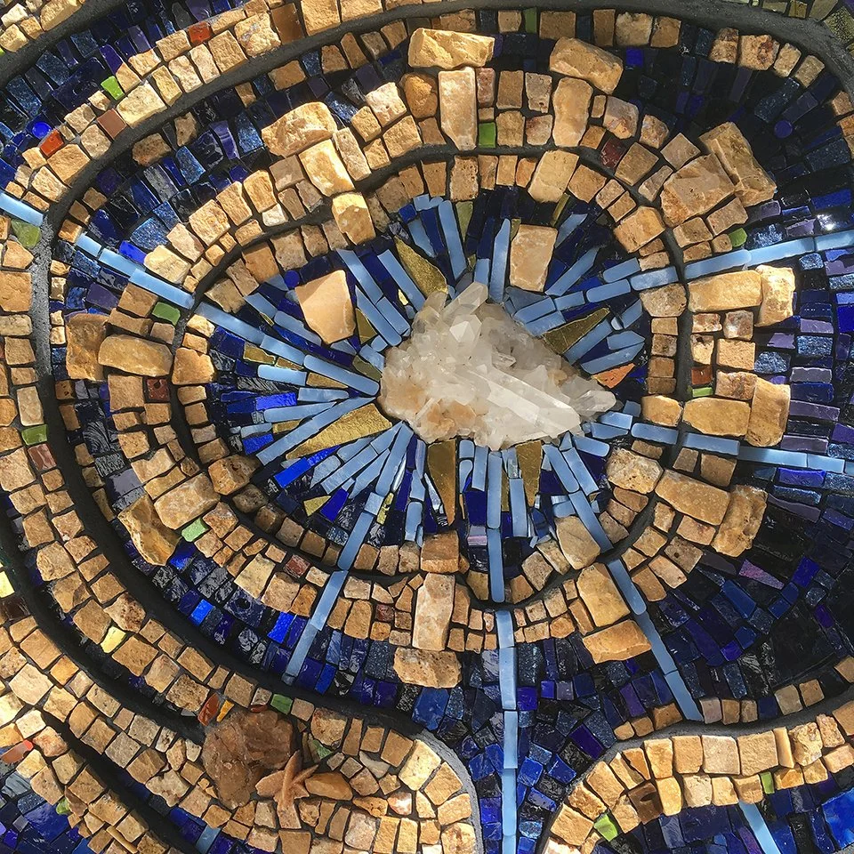 DESCRIPTION – I wanted my mosaic design to be a beautiful map of time, borrowing lines from the actual archeological site of Gobekli tepe, and building it in a way that appears thin, light and transparent, like it is floating in space – thus drawing the viewer through a portal into universal energy or Qi. The star that is most prominent in the composition represents Sirius, and the rays are in-part made with glow-in-the-dark tesserae. The placement of and the ray-points mark the consecutive circles that are traced footprints of the actual stone structures that make-up the site. The black and dark blue in the upper section represents the night sky. The three glow-in-the dark stars in the upper left are intended to be the part of Orion’s Belt that directs one to find the brightest star in the sky – that being Sirius. The seven stars in the upper right represent the Pleiades constellation, or the Seven Sisters. The bright blues and deep greens at the bottom portion represent the fertile crescent with its rich gifts and offerings from the Earth.