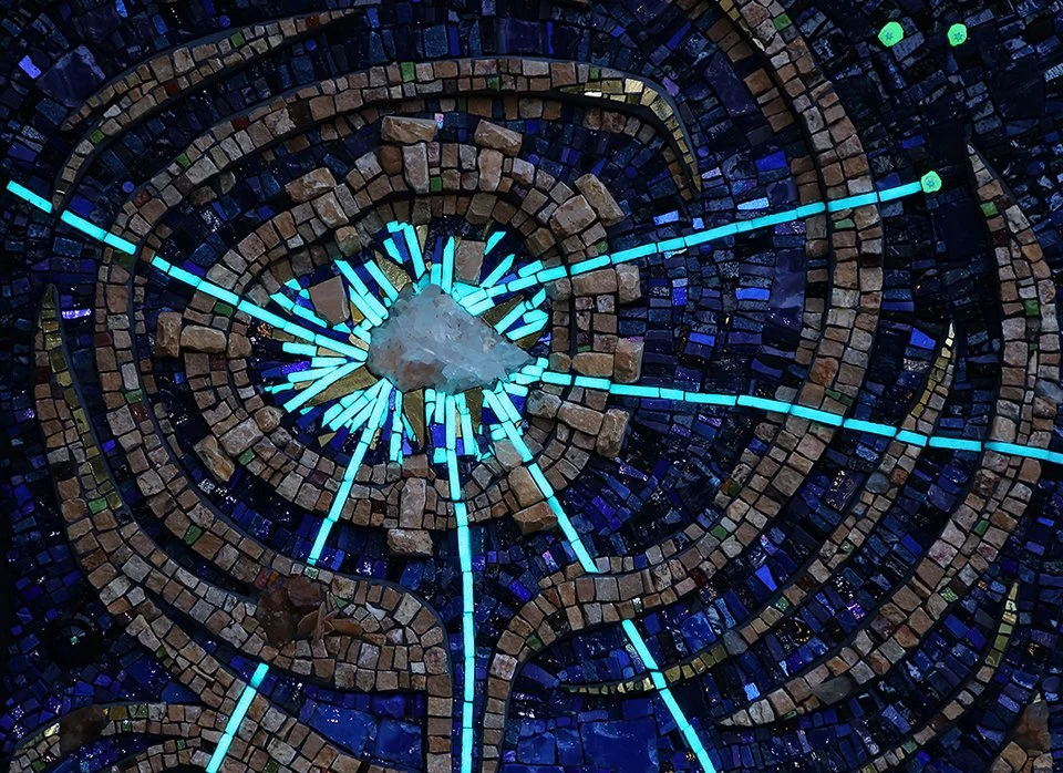 TESSERAE/MATERIALS: Marble, limestone, quartz crystals, smalti (glass), glow-in-the-dark tesserae, mille fiori stars & handblown glass cabochons – on a wood panel.