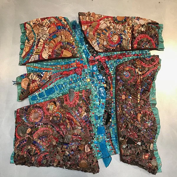 TESSERAE/MATERIALS: smalti glass, foraged natural stone and obsidian from Ploaghe, Sardinia, beach found treasures from Alghero, Sardinia, cork from Sardinia, and patina’d copper, and over a hand-sculpted EPS mounted on wood panel.