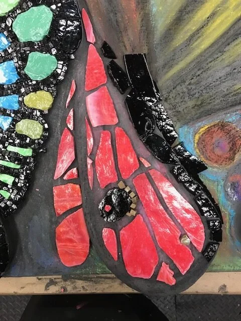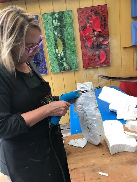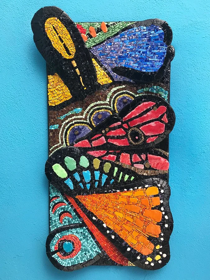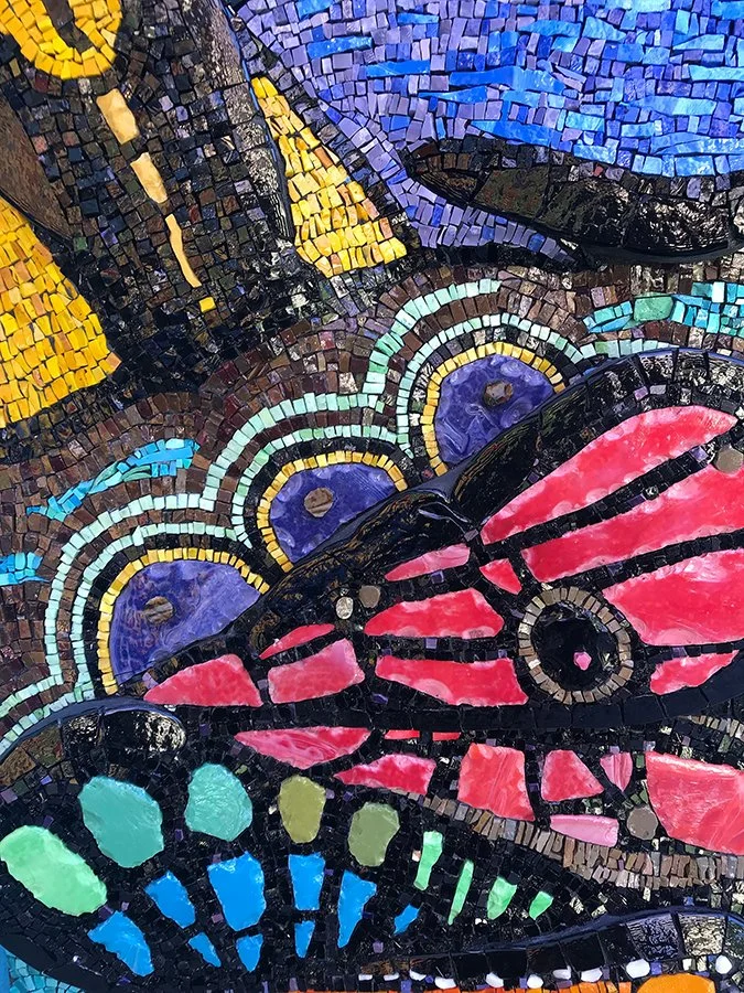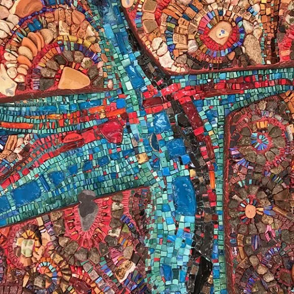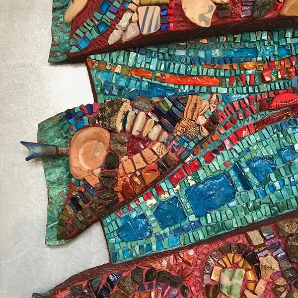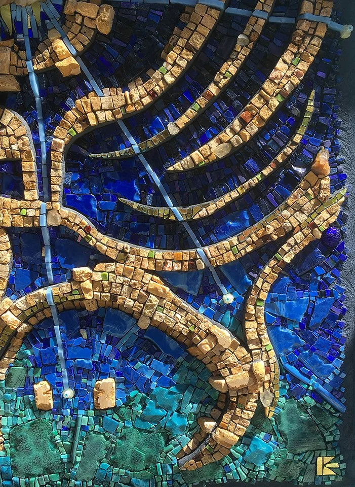 TESSERAE/MATERIALS: Italian and Mexican smalti glass, tinted thin-set, over sculpted EPS, and mounted onto a Wediboard panel.