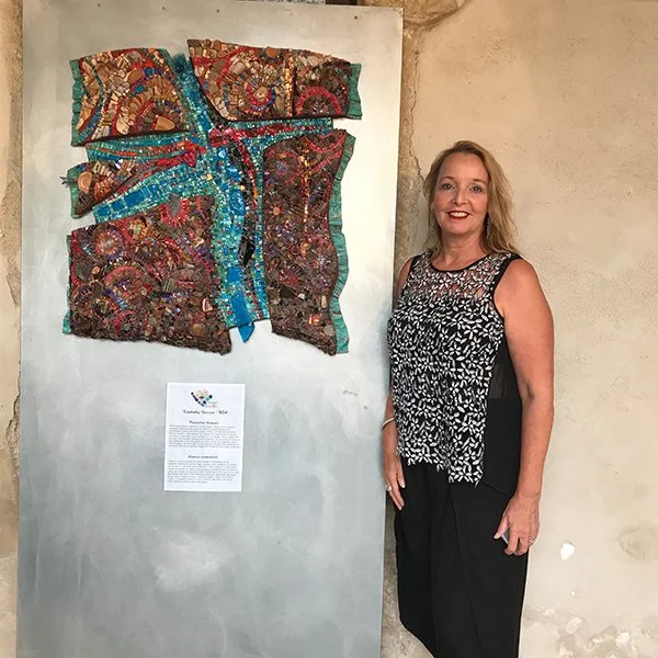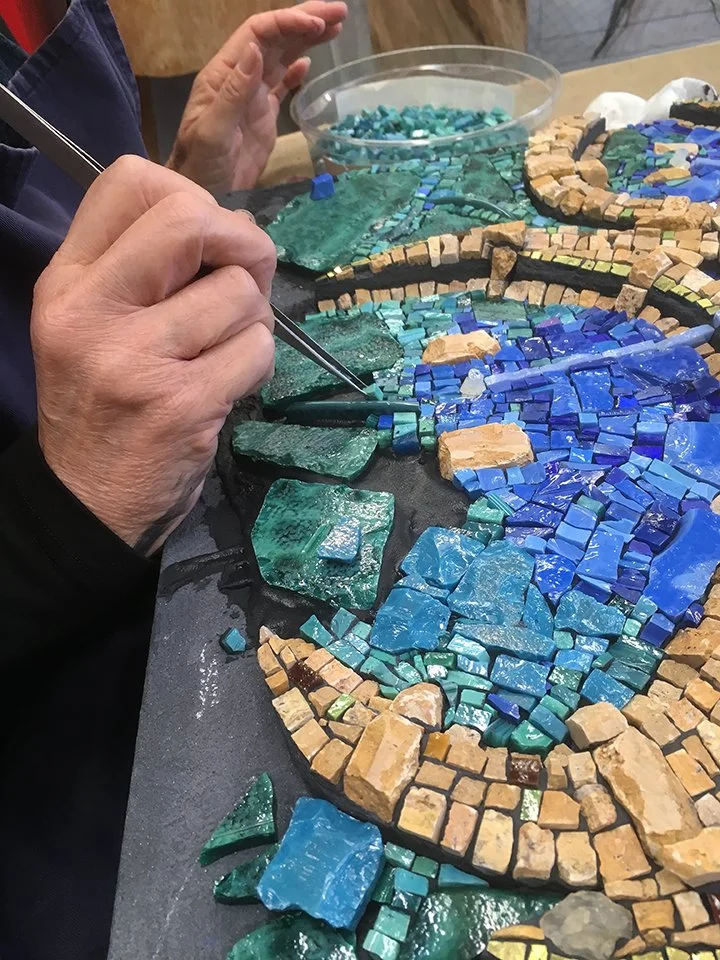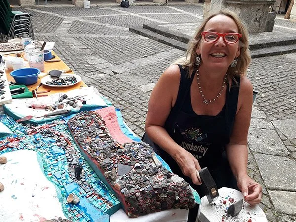 Kim Emerson participated in 4 different international symposia. Her first in 2018 and in-person, was for the 3rd annual symposium on location in the little village of Ploaghe, on the island of Sardinia, Italy. Second in 2020, she participated virtually during the shut-down of Covid again for Sardinia, Italy. And her third in 2021, Kim participated virtually for the symposium in Adana, Turkey. In-person in the summer of 2023, Kim assisted the participating artists in the production on their mosaic works for the Baja, Mexico Symposium.