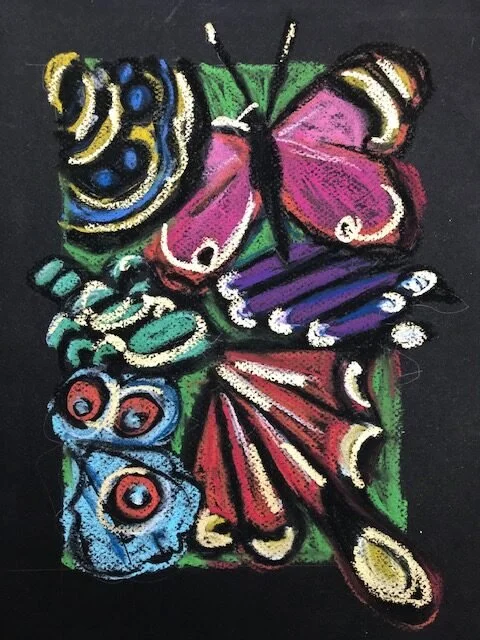 ARTIST STATEMENT – “Psyche was the ancient Greek word for both “soul” and “butterfly”. As well as in other ancient cultures, and still today for some, the belief is that human souls become butterflies while searching for a new metamorphosis or reincarnation. This personal work is an homage to my mother and to ALL souls around the globe who are lifting upward from the physical body to higher realms. The bright colors are intended to be uplifting and the heaviness of the intense black represents the physical body that no longer serves the spirit wanting to be free.”