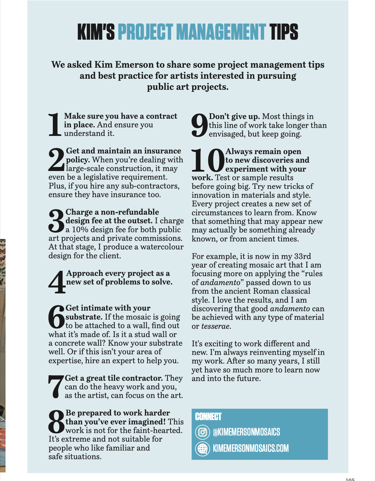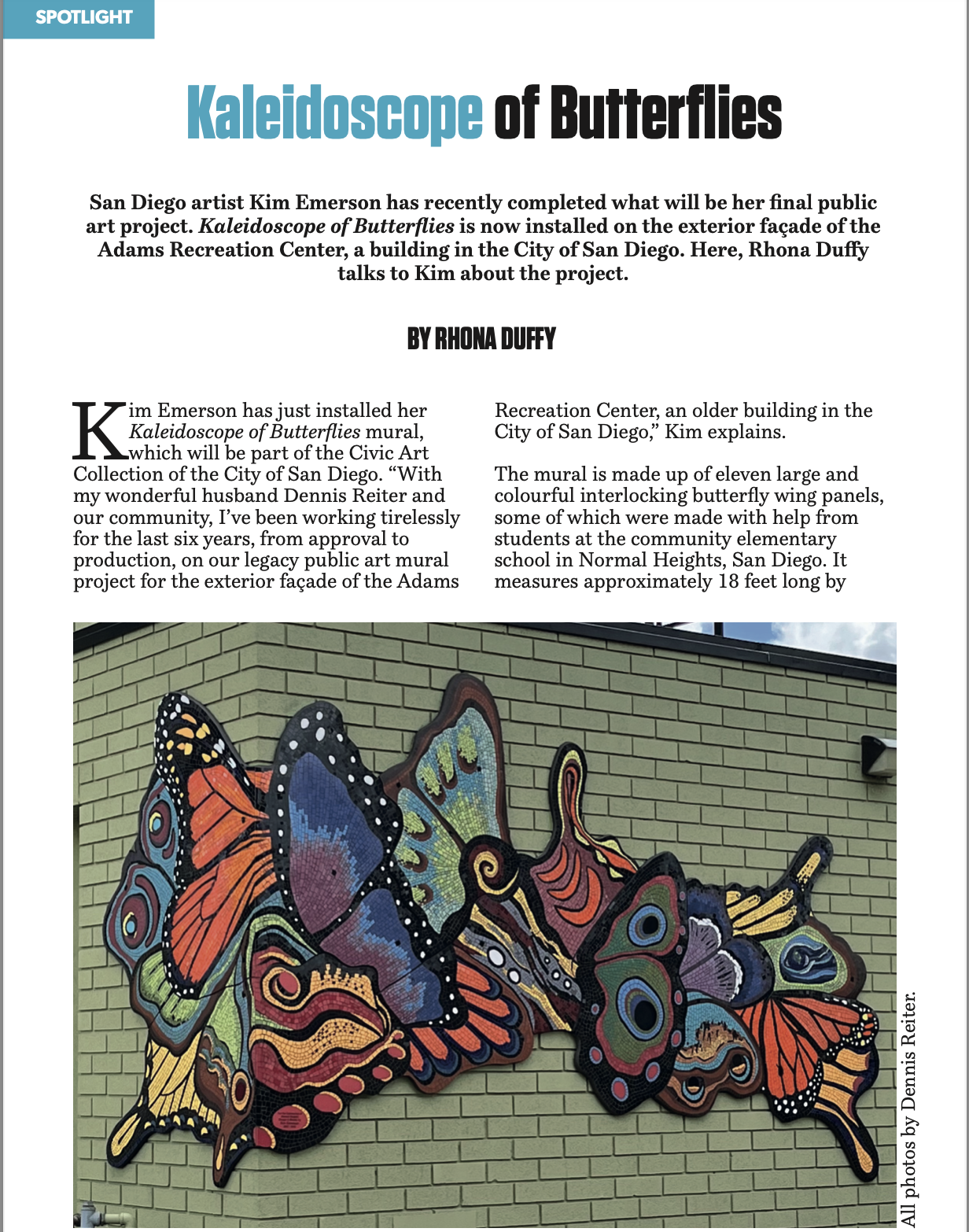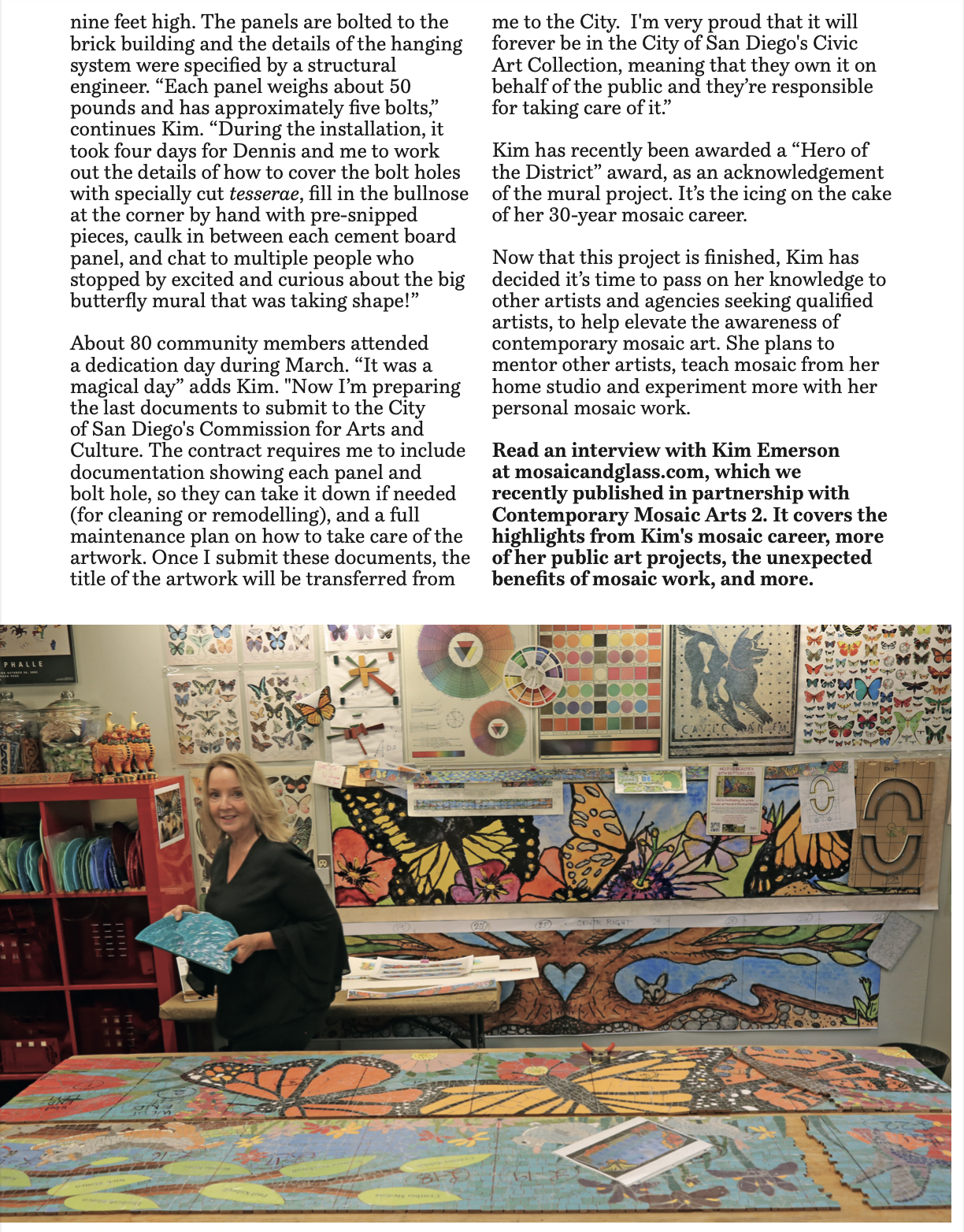 Thank you Rhona Duffy of Mosaic and Glass Magazine and Pam Givens of the mosaic artist organization, Contemporary Mosaic Art (CMA2), for establishing the connections and introductions to produce this wonderful article.